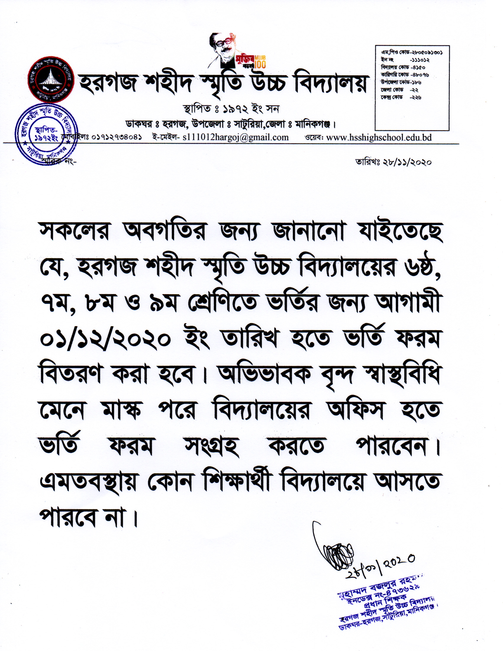 ভর্তি বিজ্ঞপ্তি ২০২১: আগামী ০১/১২/২০২০ ইং তারিখ হতে ২০২১ সনের ভর্তির ফরম বি