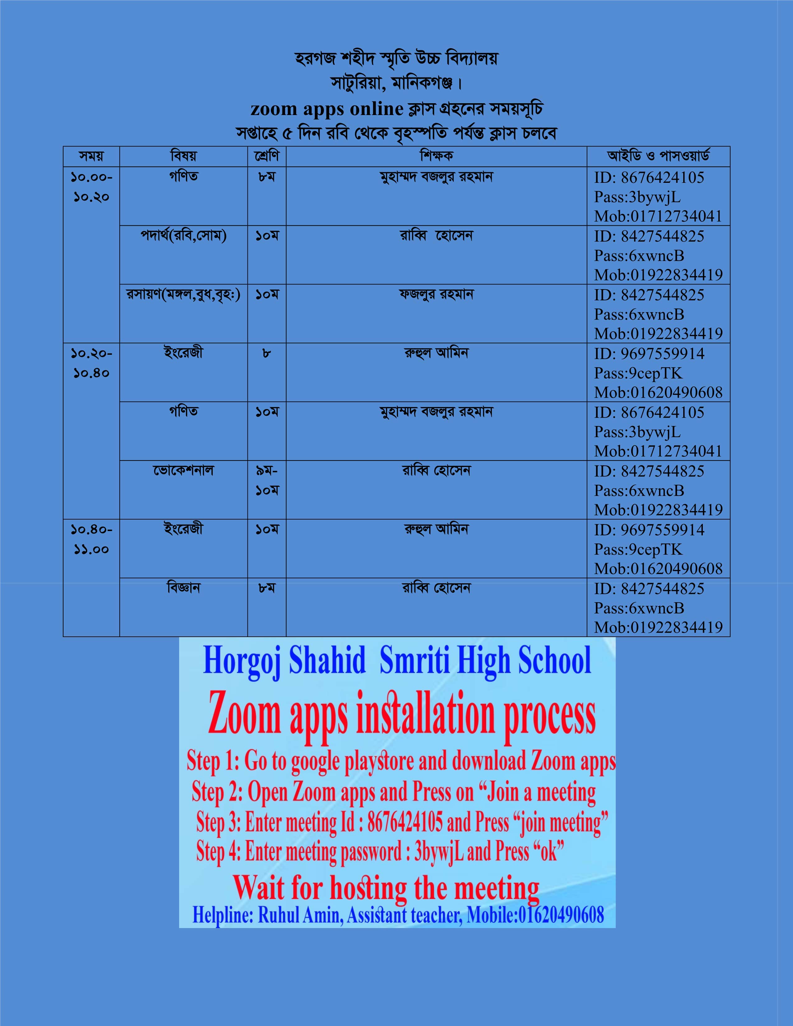 আগামী 03/05/2020 তারিখ হতে হরগজ শহীদ স্মৃতি উচ্চ বিদ্যালয়ে জোম অ্যাপস এর মাধ্যমে ভিডিও কনফারেন্সিং ক্লাস শুরু হবে। তাই সকল শিক্ষার্থীদের ক্লাশ কার্যক্রমে অংশগ্রহণ ও নির্দেশনা অনুসরণ করার নির্দেশ দেওয়া হল।
